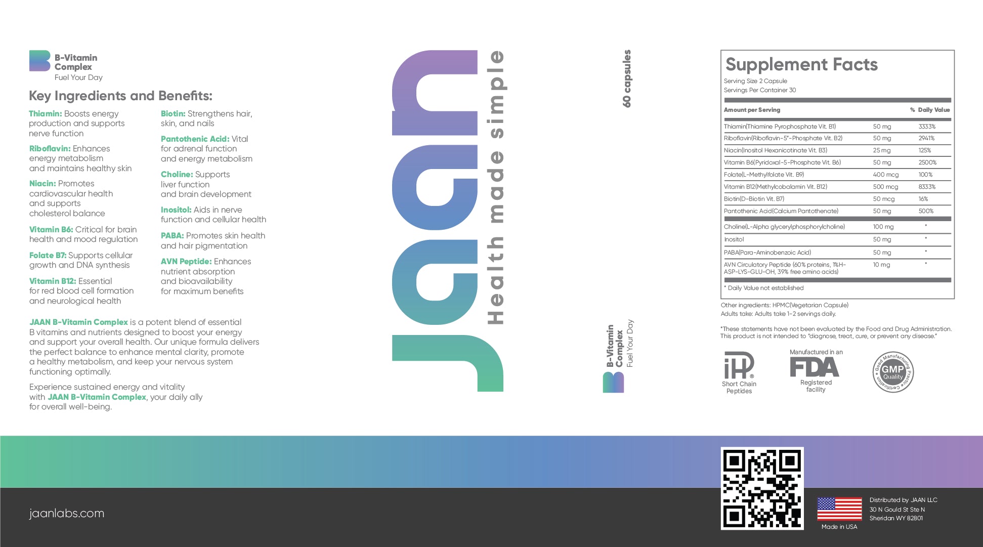 Jaan B-Vitamin Complex is a high-potency B-complex supplement, formulated for optimal absorption and effectiveness. Unlike generic formulas, it features bioavailable B vitamins paired with AVN Peptide, a breakthrough ingredient that enhances nutrient delivery to maximize absorption and benefits.